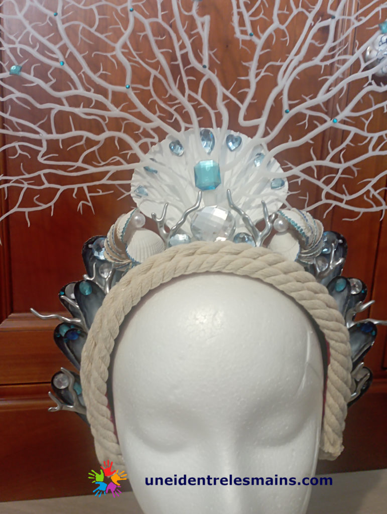 Après, j’ai créé de nombreux accessoires. Tout d’abord un serre-tête customisé avec de nombreux coquillages, moules, coques, faux corail, perles et strass. J’ai collé un cordage sur un serre-tête assez large. Ensuite, j’ai collé au pistolet à colle un énorme corail, mais très souple et assez léger. J’ai ensuite défait un collier fait de branches de coraux en plastique. Je les ai bombées en argent et collées. J’ai ajouté des coquilles de moules que j’ai également peintes en argent. Je n’avais pas collé de pinces crocodiles sous le serre-tête afin de bien le maintenir sur la perruque et cela a vraiment manqué.