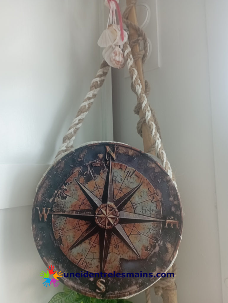 J’ai également créé un sac à partir de set de table en plastique et d’une tresse à 6 brins de ficelle de jute et d’une cordelette de coton. La dimension du sac a été fonction d’une plaque émaillée achetée façon rose des vents.